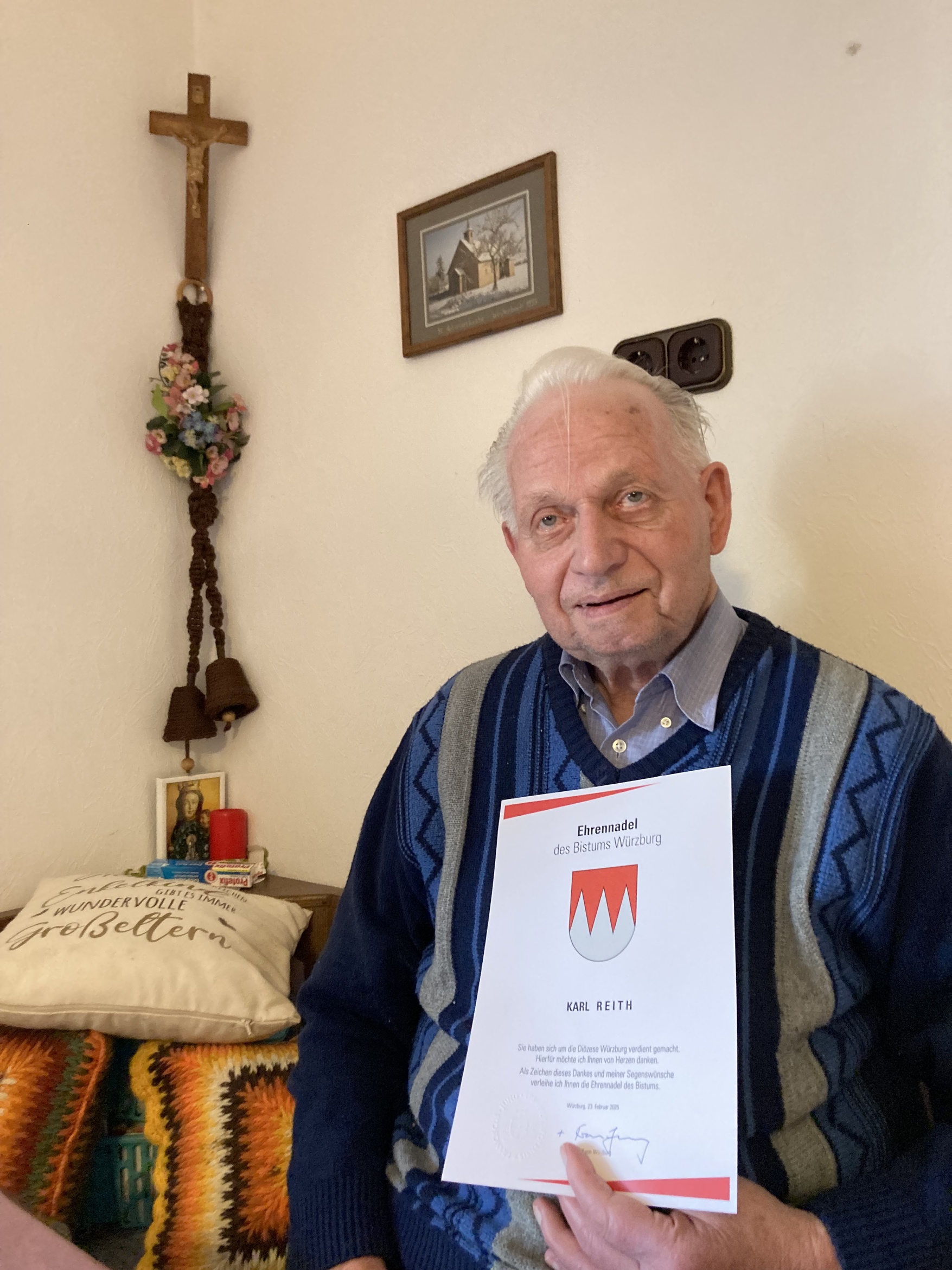 Karl Reith konnte aus gesundheitlichen Gründen nicht an der Ehrung teilnehmen. Pfarrer Armin Haas überreichte dem langjährigen und verdienten Kirchenpfleger zu Hause persönlich die Dankesurkunde und die Ehrennadel des Bistums Würzburg.