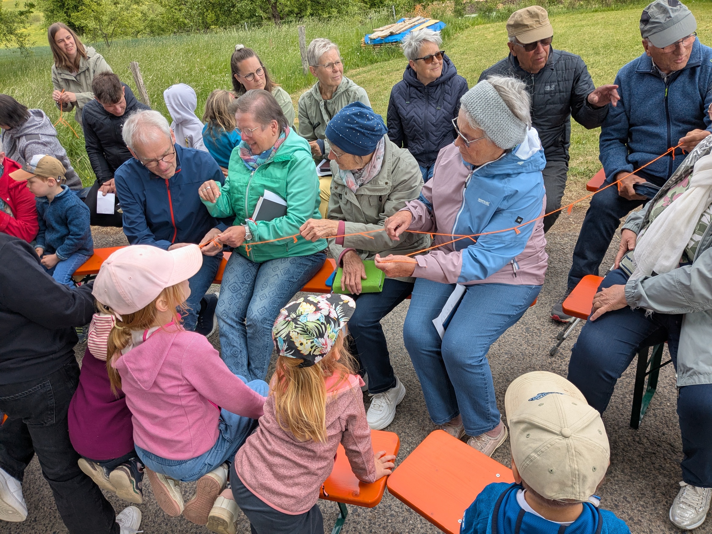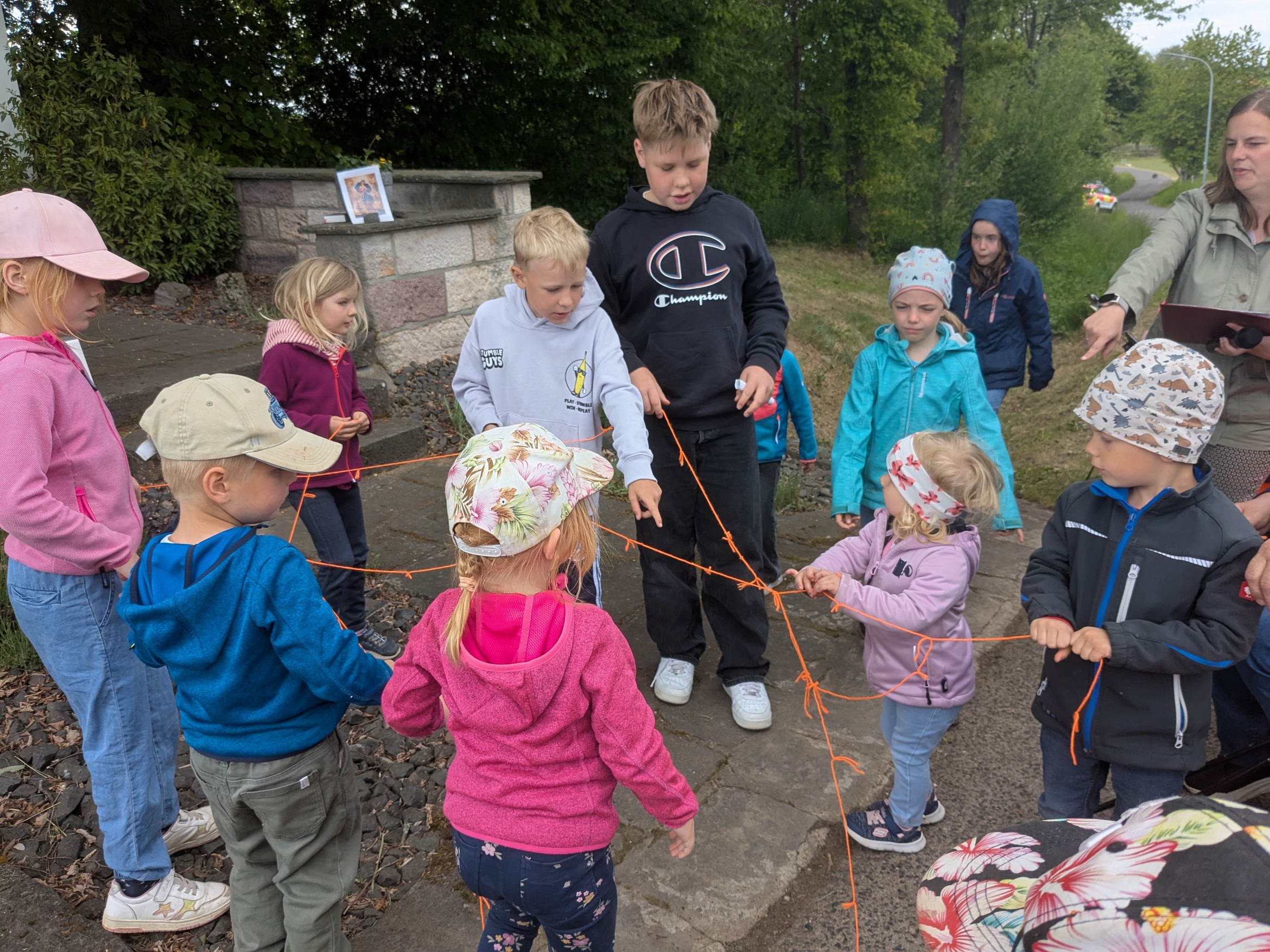 Die Veranstaltung war lebendig gestaltet: Familien mit Kindern sowie ältere Menschen wurden aktiv in die Andacht eingebunden. Jeder erhielt einen Faden, der symbolisch für die Herausforderungen im Leben stand. Die Teilnehmenden konnten einen Knoten in ihren Faden binden, was die Schwierigkeiten oder Probleme im Alltag repräsentiert. Doch der Knoten ist auch ein Symbol für Verbindung und Zusammenhalt. Gemeinsam haben alle ein großes Netz geknüpft, das für die Gemeinschaft im Ort und den Glauben steht. Dieses symbolische Netz wurde von den Kindern vor das Heilige Häuschen gelegt.