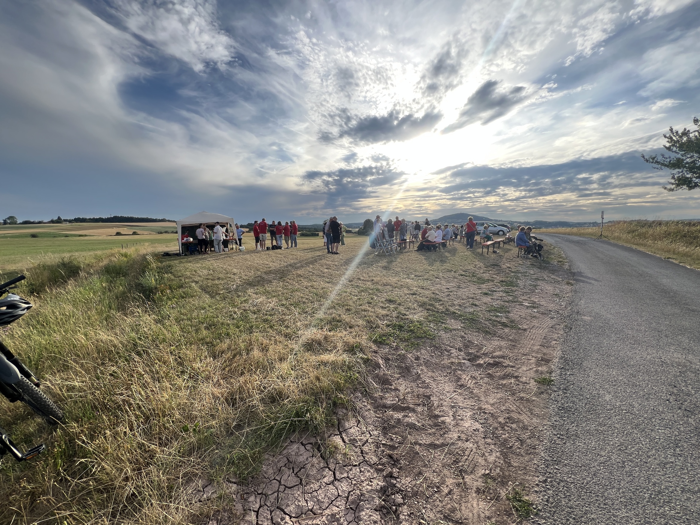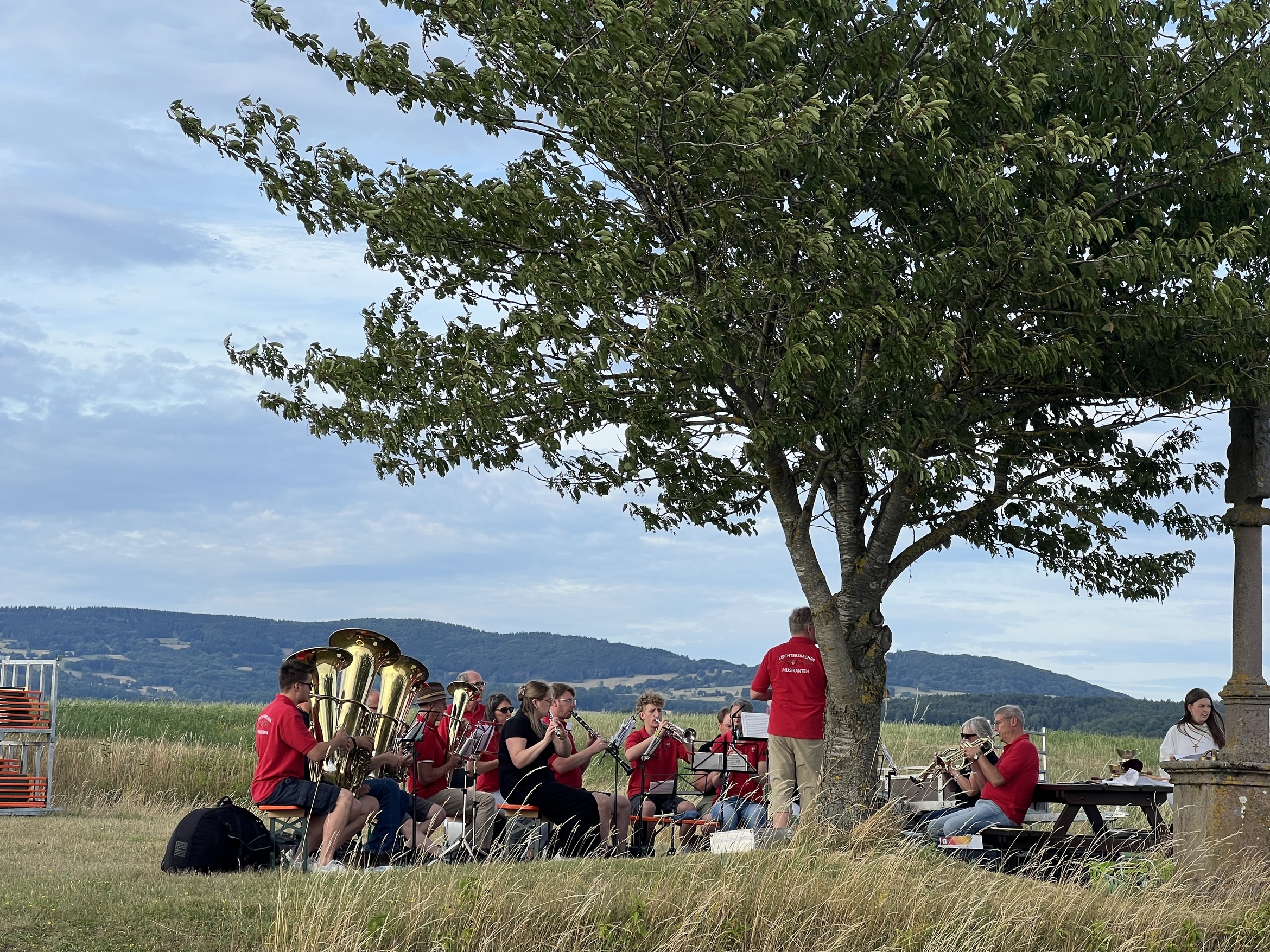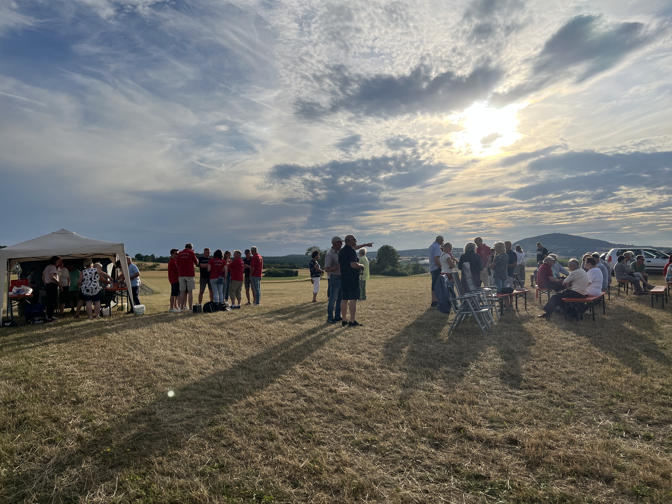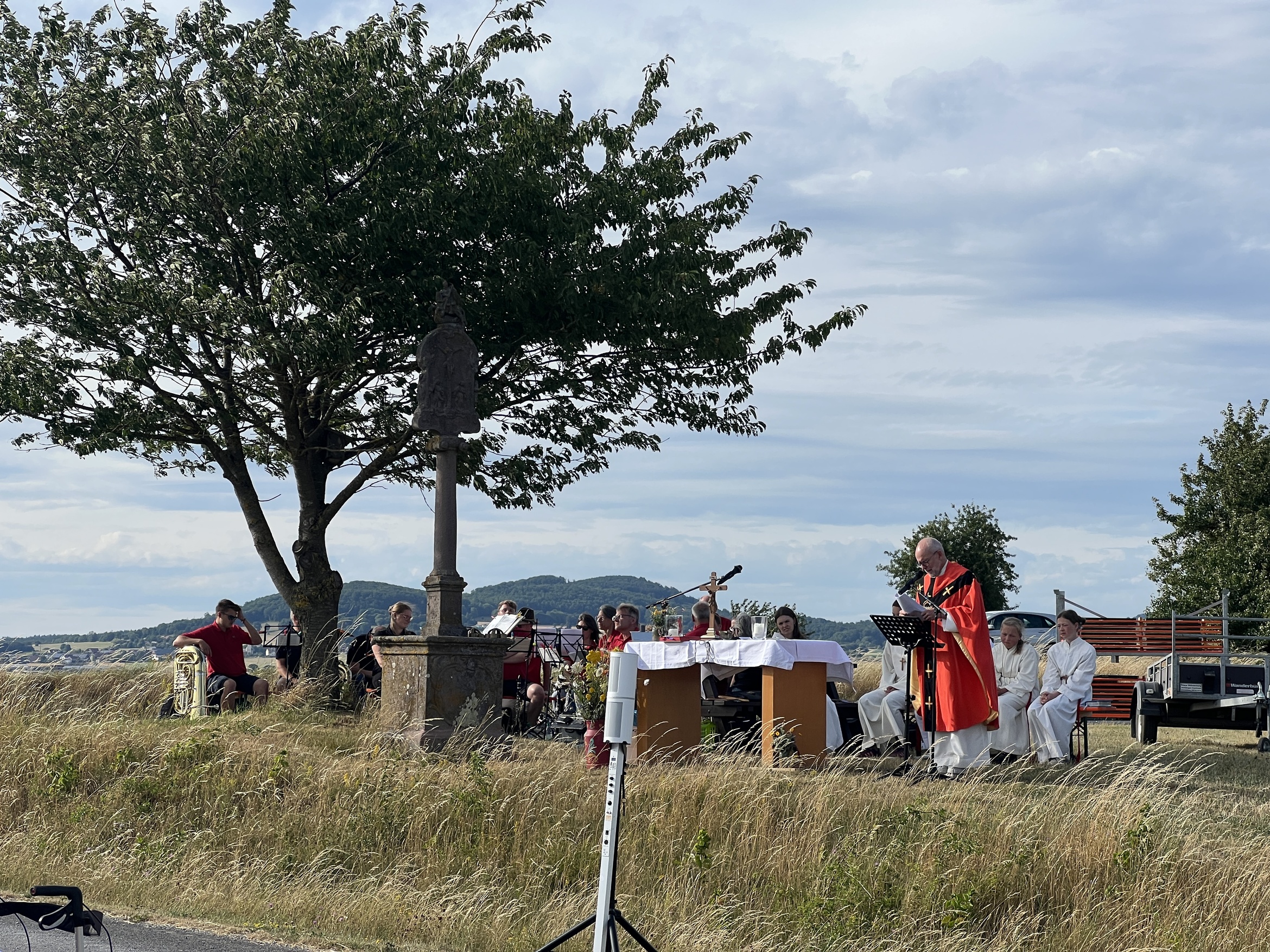 Pfarrer Armin Haas zelebrierte den Distelfeldgottesdienst, der alle 2 Jahre immer am 1. Samstag im Juli stattfindet. In seiner Predigt ging er auf die Frankenaposteln ein, die sich mit viel Mut von Irland über das Meer bis zu uns nach Unterfranken machten, um das Wort Gottes zu verkünden. In den frei formulierten Fürbitten baten die Gläubigen um gutes Wetter für die Ernte, für unsere Gemeinschaft, dass Amokläufe nicht mehr stattfinden sollen usw.