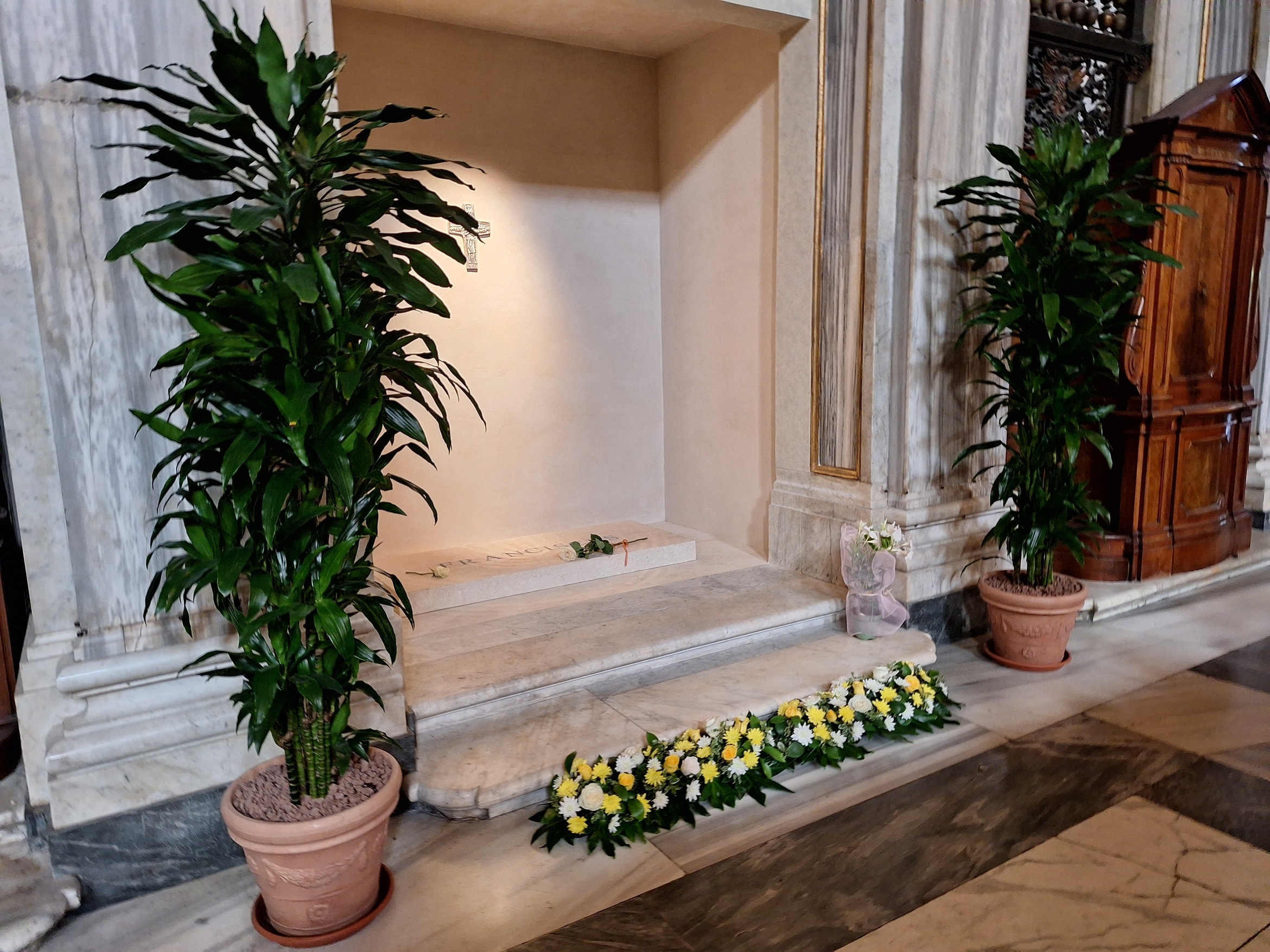 Am Pfingstsonntag stand das kirchliche Rom auf dem Programm. Mit viel Glück konnten wir ohne großes Anstehen die päpstliche Basilika Santa Maria Maggiore betreten. So durften wir als Erste die Heilige Pforte betend durchschreiten. Hinter der Heiligen Pforte stellten wir uns an, um an das Grab des verstorbenen Papst Franziskus zu kommen. Leider ist allen nur ein ganz kurzer Augenblick am Grab vergönnt: jedem wird gedankt und gleich darauf aufgefordert, weiter zu gehen. Da gleich danach das Hochamt von Pfingsten begann, konnten wir nicht die sehr verehrte Ikone von Santa Maria Maggiore in Augenschein nehmen. So trafen wir uns vor der Kirche, um in einer danebenliegende Kirche Sante Prassede für unsere Pilgergruppe eine Pfingstandacht zu feiern. Diese Kirche ist berühmt durch die vielen schönen Mosaiken aus der byzantinischen Zeit und in einer Seitenkapelle ist eine Reliquie: ein Säulenfragment, das von der Säule stammen soll, an der Jesus Christus gegeißelt wurde, die so genannte Geißelsäule.