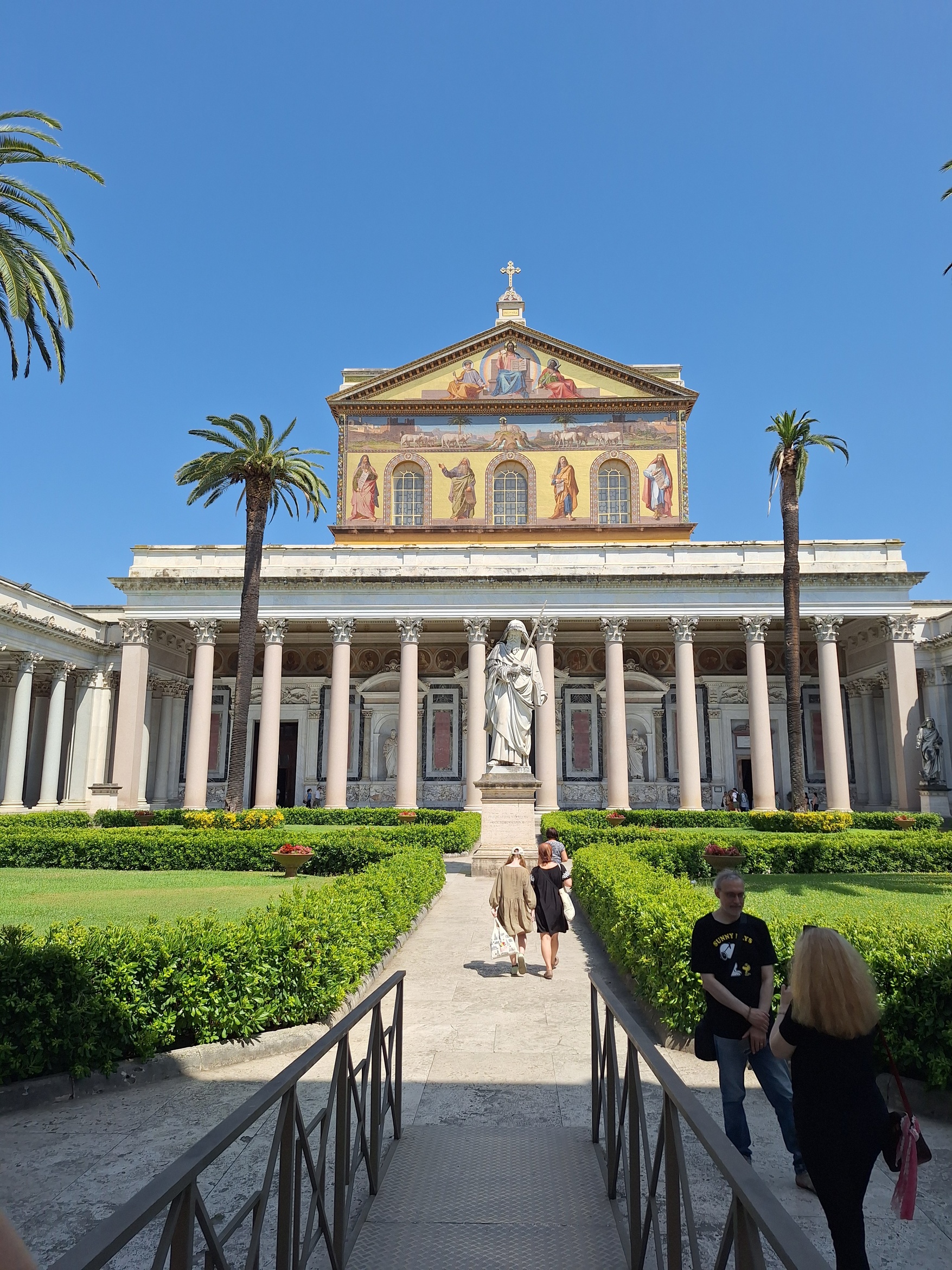 Der Bus fuhr uns nach der italienischen Fiesta aus dem Zentrum Roms und ließ uns an der 3. päpstlichen Basilika an diesem Tag heraus. So standen wir vor der San Paolo fuori le mura (Basilika Sankt Paul vor den Mauern). Sehr beachtliches Bauwerk mit dem Vorgarten und imposanten Mosaiken am Dachgiebel. Da in den Stunden der Fiesta unser Besuch lag, hatten wir zum dritten Mal Glück an diesem Tag und konnten fast ohne Warten auf die dritte Heilige Pforte gehen und jeder ging mit seinen Anliegen und Bitten durch die Heilige Pforte. In dieser Kirche befindet sich das Grab des Völkerapostel Paulus und die Reliquie, die Kette, an dem er gefesselt wurde, ist über seinem Grab im Glasschrein aufgestellt. In dieser Basilika sind alle Päpste in einem Medaillon mit Mosaiksteinen an der Decke abgebildet. Bei Papst Leo XIV ist nur ein beleuchtet leeres Medaillon zu sehen. Nachdem wir an diesem Tag drei heilige Pforten durchschritten haben, war bei allen die Luft raus und so fuhr uns der Bus zum Hotel zurück und jeder durfte den Abend frei genießen.