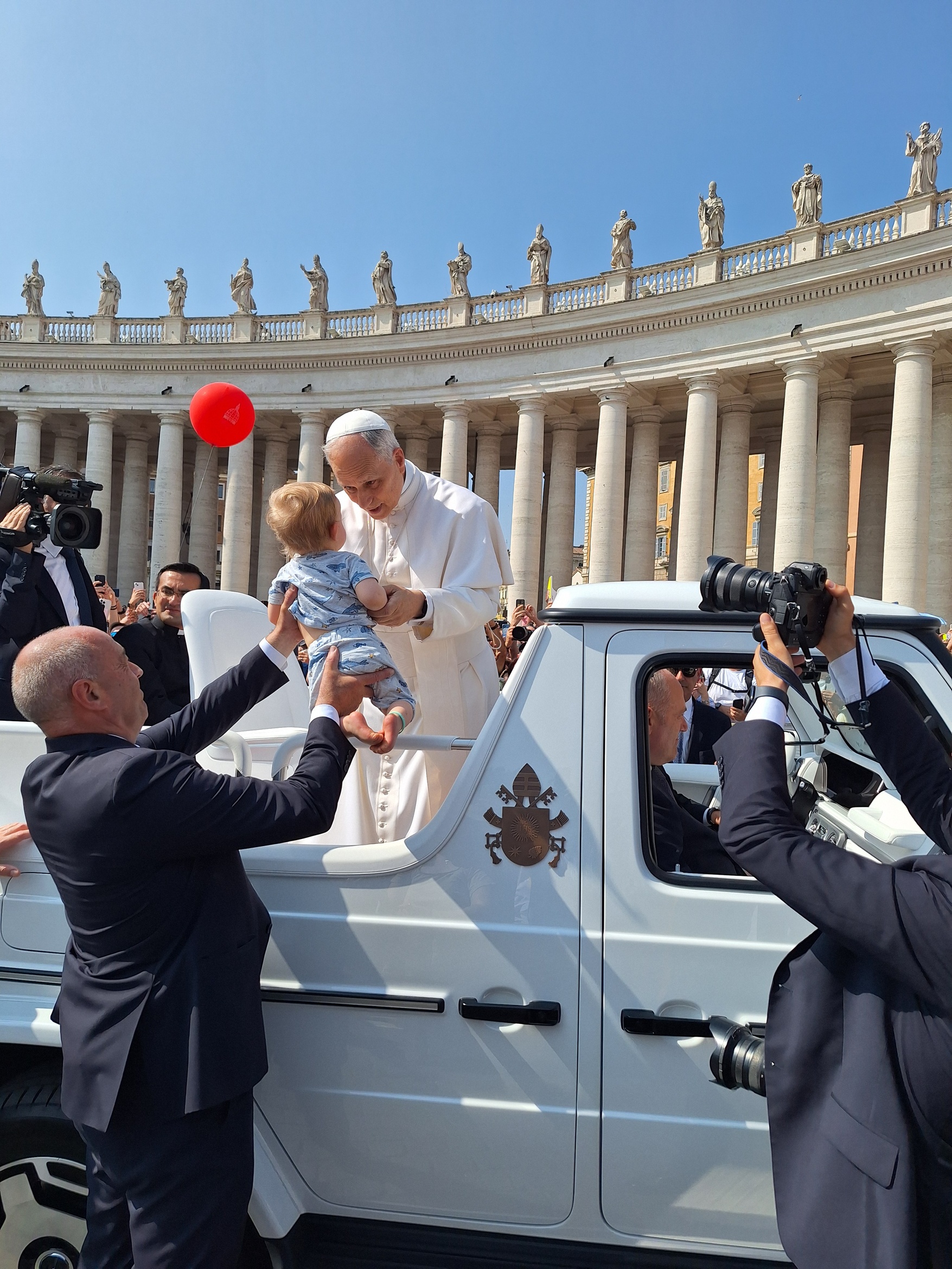 Am letzten Tag sollte uns die Begegnung mit Papst Leo XIV bevorstehen, deshalb machten wir uns sehr früh auf zum Petersplatz, denn es wurden ca. 45.000 Besucher für die Generalaudienz erwartet (i.d.R. sind es 5 bis 6 Tausend Menschen). Da unsere Gruppe aufgeteilt wurde, hatten wir für alle einen guten Platz gefunden. Kurz vor 10.00 Uhr fuhr Papst Leo XIV auf dem Petersplatz mit Jubel und "Papa Leon" wurde von den zahllosen Besuchern herzlich und euphorisch begrüßt. Enttäuschend für unser Elternpaar, mit ihrem kleinen Sohn fuhr der Papst einfach vorbei. Der Schweizer Gardist tröstete uns, Papst Leo XIV kommt noch einmal an dieser Stelle vorbei. Voller Erwartung, dass Papst Leo XIV unseren jüngsten Pilger persönlich segnet, warteten wir auf die zweite Gelegenheit. Tatsächlich nahm unser neuer Papst Leo XIV E. in seine Hände und segnete ihn persönlich. Anschließend schaute er nach seinen Eltern und segnete sie auch und blickte freundlich in meine Kamera. Welch ein unvergessliches Erlebnis für unsere Pilgergruppe! Während der Audienz hat Papst Leo XIV unsere Andachtsgegenstände auch gesegnet. Nach der Audienz besuchten wir noch den deutschen Friedhof im Vatikan. Auf dem Weg zum Hotel wurde die letzte Gelegenheit genutzt, um Souvenirs für die Lieben zu Hause zu kaufen. Mit dem letzten Mittagessen in Rom haben wir die Tage in Rom beendet. Spätnachmittag ging unser Flieger wieder nach Frankfurt, dort holte uns der Bus ab und brachte uns wieder nach Bad Brückenau.