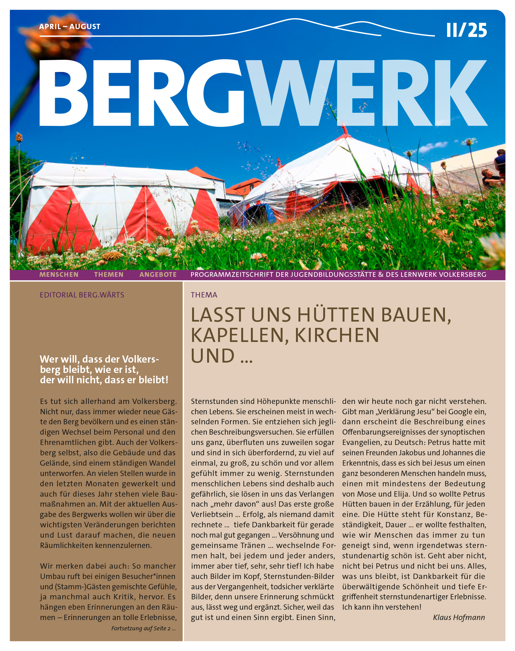 Die neue Ausgabe der Programmzeitschrift Bergwerk der Jugendbildungsstätte und des Lernwerks Volkersberg ist erschienen. Im inhaltlichen Teil berichtet das Volkersbergteam von einigen Veränderungen und Renovierungen in seinem Bildungshaus. Dabei gilt es immer einen Brückenschlag zwischen Vergangenheit und Zukunft zu wagen. Auch gibt es eine erste Einladung anlässlich des Heiligen Jahres 2025 zu einer Nacht der Hoffnung am 18. Juli in der Wallfahrtskirche auf dem Volkersberg. In der neuen Bergwerkausgabe sind außerdem alle Volkersbergangebote von April bis August zu finden. Interessierten wird das Bergwerk kostenfrei zugeschickt. Es kann unter 09741/913200 oder info@volkersberg.de angefordert werden.