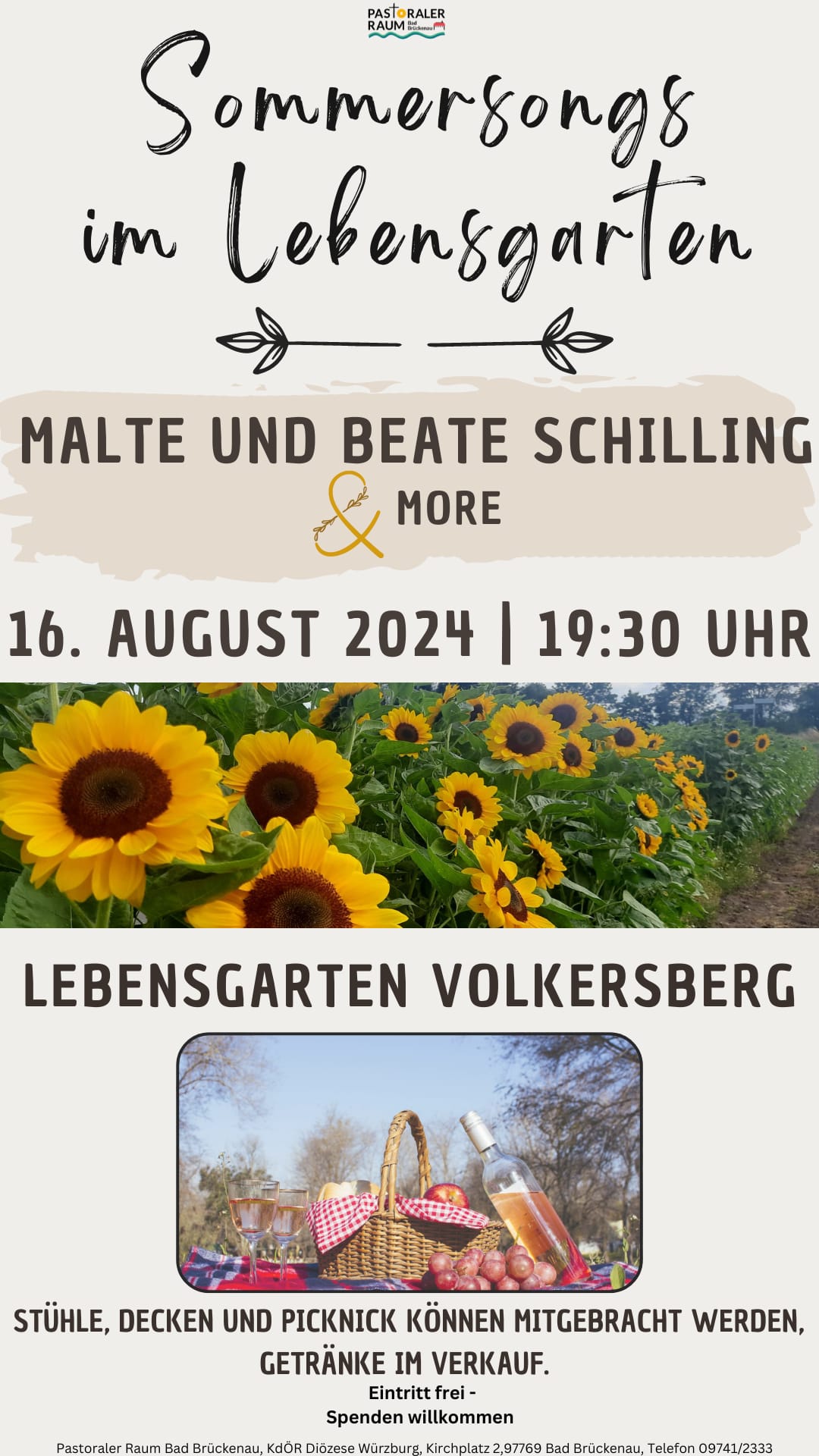 Der Pastorale Raum Bad Brückenau lädt am Freitag 16.8.2024 um 19:30 Uhr zu Sommersongs im Lebensgarten auf den Volkersberg ein. Malte und Beate Schilling spielen mit befreundeten Musikern sommerliche Lieder zum Zuhören und Mitsingen. Der Lebensgarten wird dazu stimmungsvoll beleuchtet sein. Stühle, Decken und Picknick können mitgebracht werden. Getränke gibt es vor Ort. Der Eintritt ist kostenfrei.