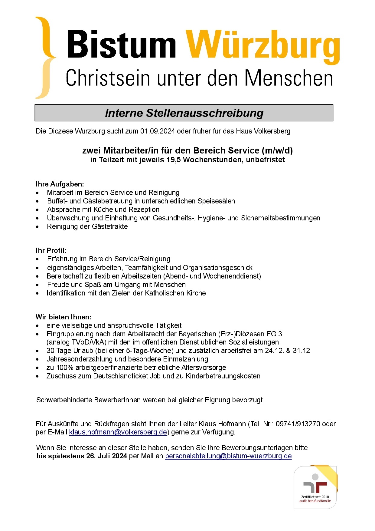 Bewerbungen bis spätestens 26.7.2024 per E-Mail an: personalabteilung@bistum-wuerzburg.de