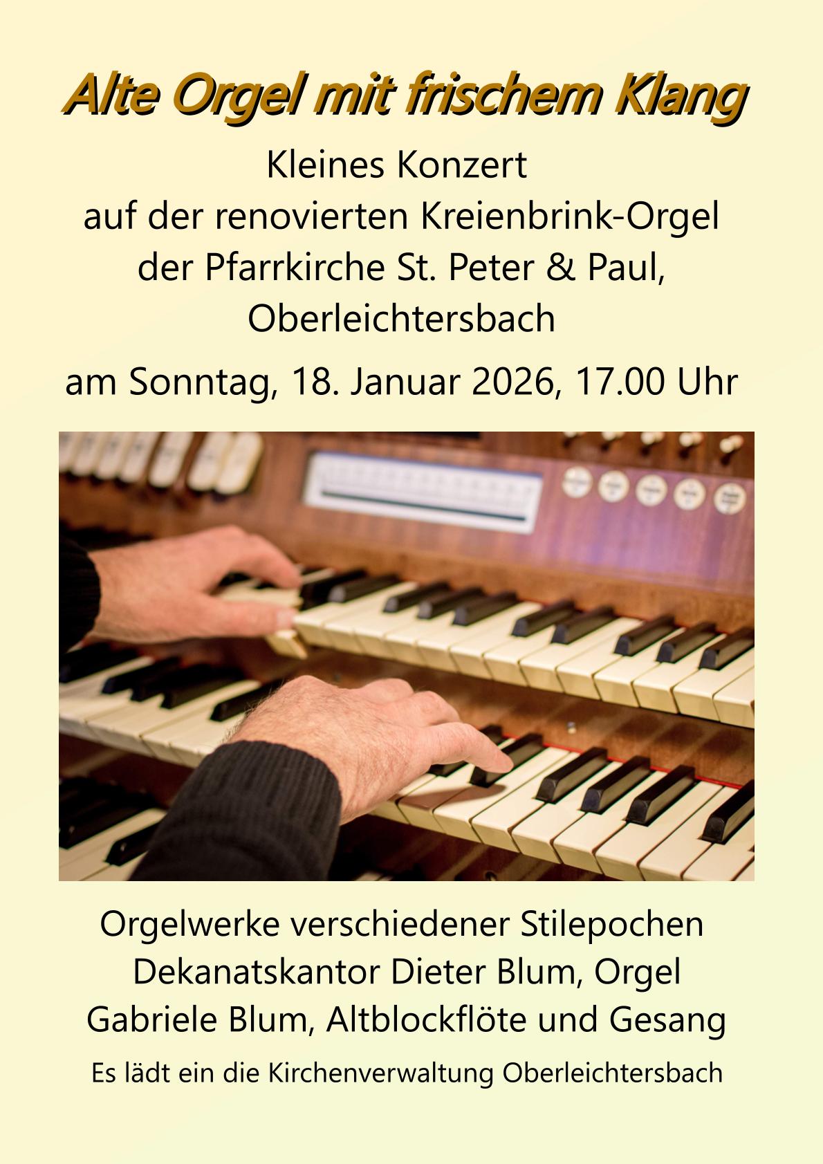 Anlässlich der Orgelrenovierung findet am Sonntag, den 18.01.2026 um 17.00 Uhr ein Konzert in der Pfarrkirche St. Peter und Paul in Oberleichtersbach statt.