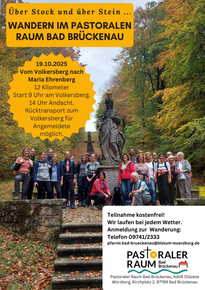 Der Pastorale Raum Bad Brückenau lädt am 19.10.2025 zu einer Wanderung vom Volkersberg auf Maria Ehrenberg ein. Während der 12 Kilometer langen Strecke kann man neue Leute kennenlernen, über Gott und die Welt reden, bekommt spirituelle Impulse und interssante Informationen.