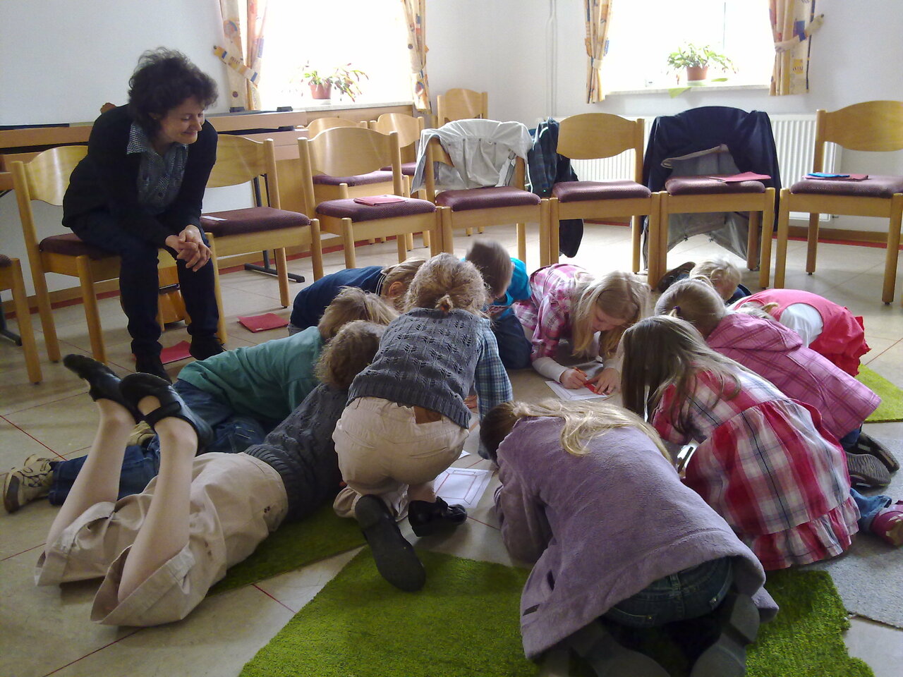 Wir sind ein Team, bestehend aus z.Zt 10 Frauen, die sich dabei abwechseln, in unserer Pfarrgemeinde einmal pro Monat einen Kindergottesdienst vorzubereiten und durchzuführen. Am Schuljahresanfang legen wir ein Thema fest, das sich wie ein roter Faden durch die Kindergottesdienste zieht. Dieses Jahr dreht sich alles um das „Vater Unser“